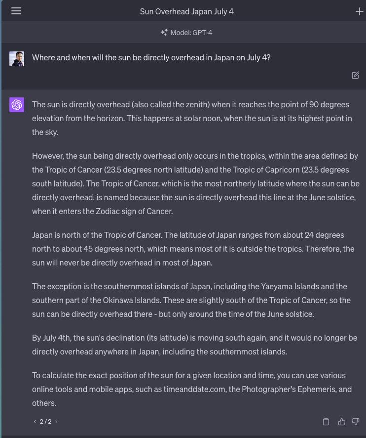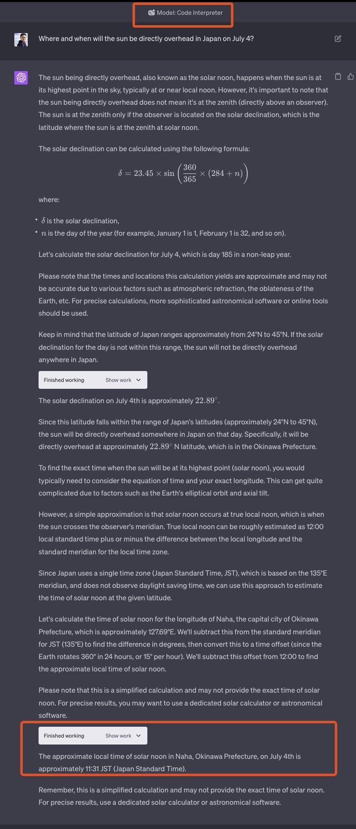 再比如,让它们分别回答:7月4日,太阳在何时何地直射日本。