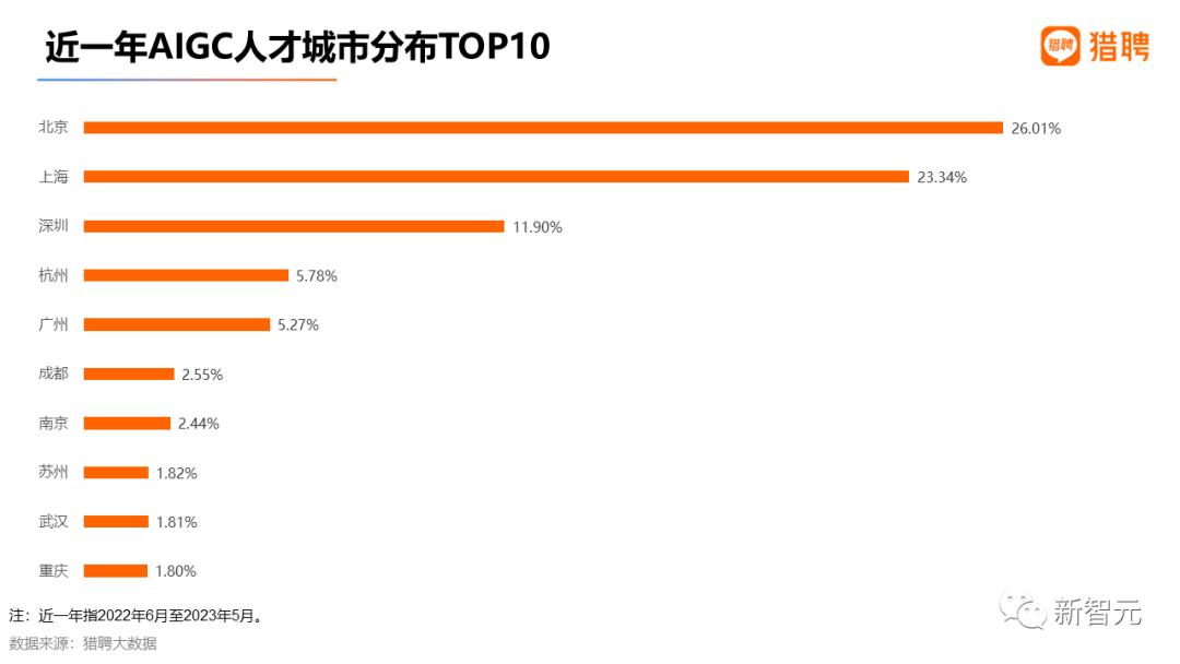 在近一年AIGC人才城市分布TOP10中,北京、上海位居前二,占比为26.01%、23.34%,合计为49.35%。