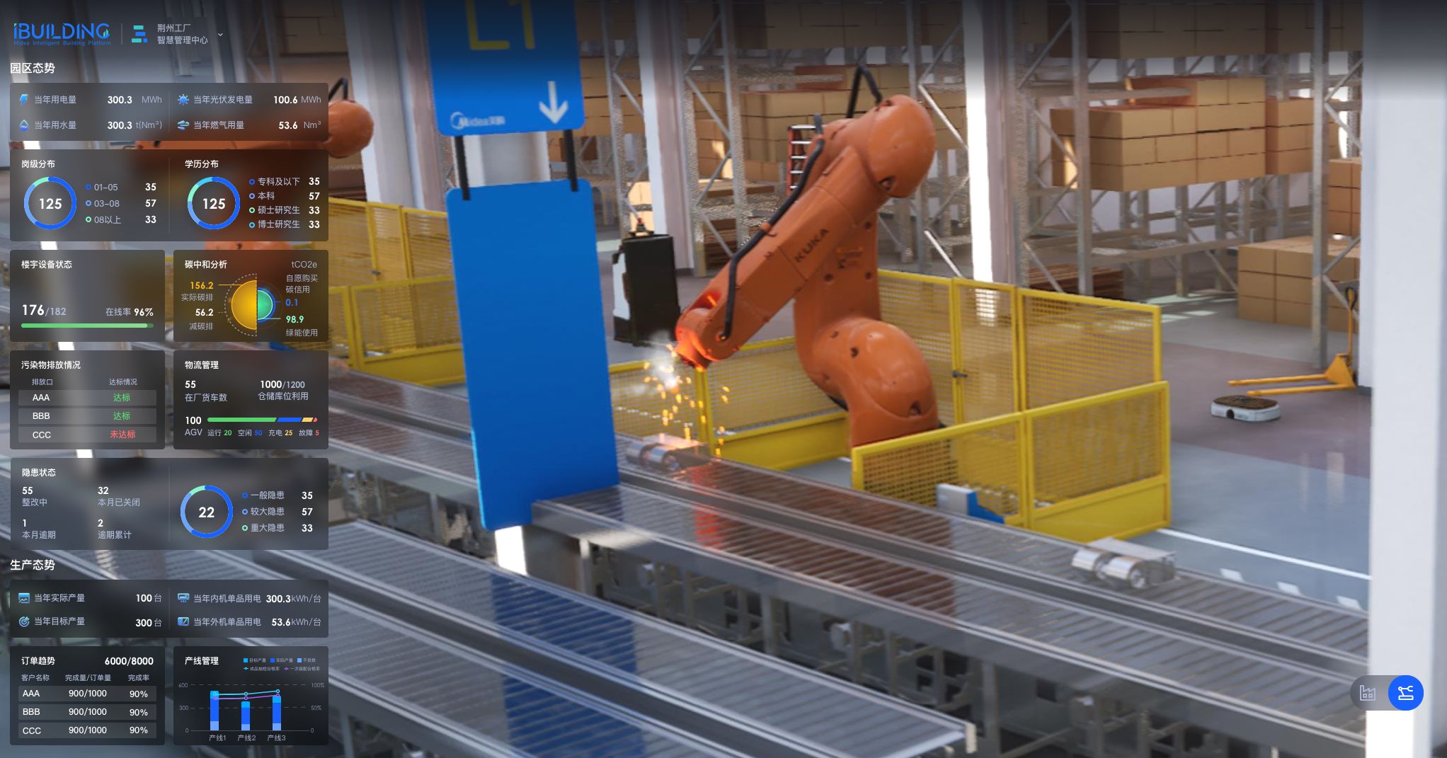 在数智零碳工厂的样板——美的楼宇科技荆州工厂,iBUILDING智慧运营中心可以对工厂实况进行全场景、总览式呈现,从产品质量、设备运行、生产情况、碳排和能耗、园区安全等维度进行综合监测分析,帮助管理者全面快速掌控厂区运行态势,促进协同管理和生产链的全程优化。