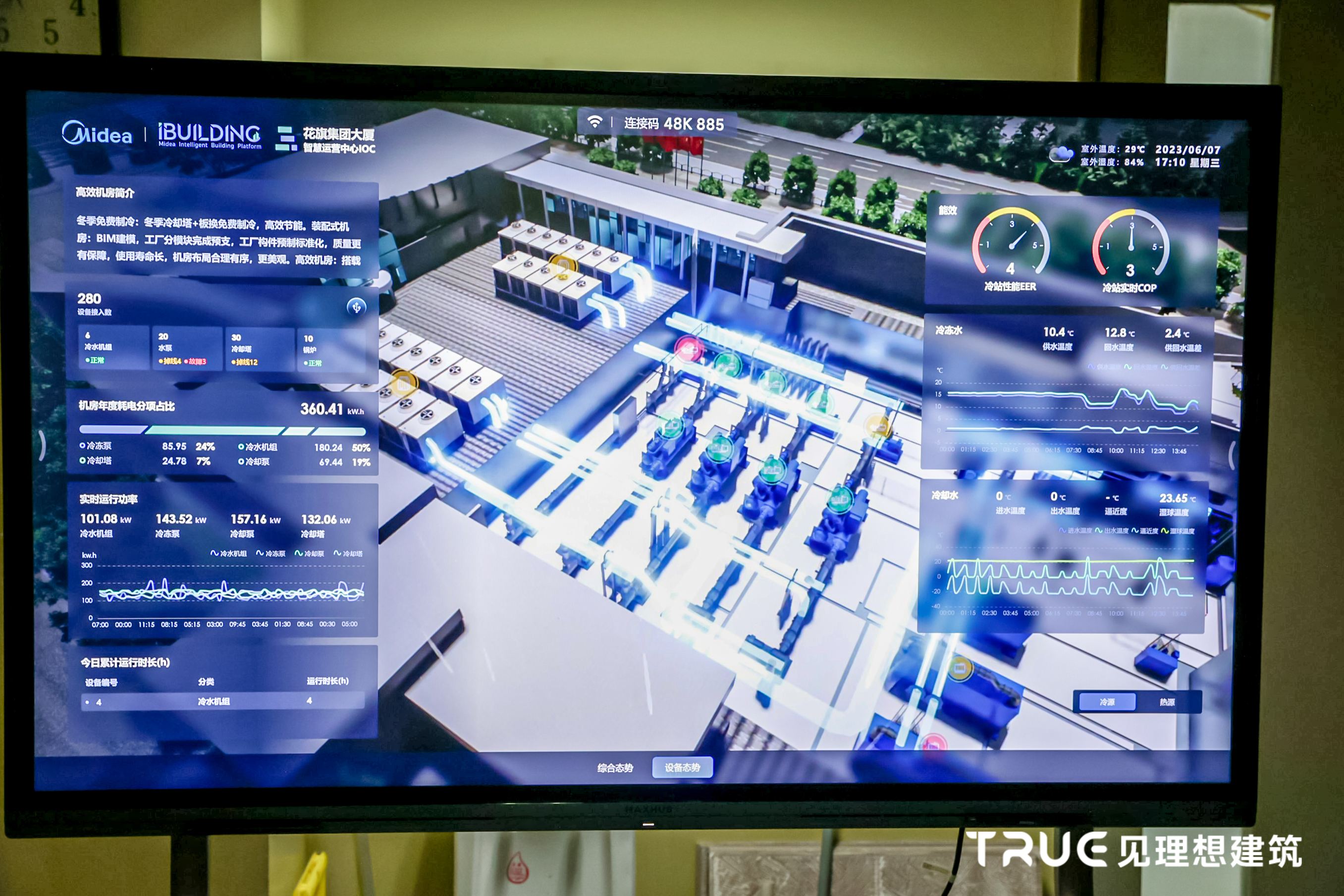 在改造过程中,美的楼宇科技在硬件设备上采用了鲲禹磁悬浮变频离心机组,软件层面则是以iBUILDING底层数字能力为支撑,应用美的iBUILDING智慧运营中心IOC及云能效管理平台,实现整个大厦的能耗管理、负荷控制和高效运维,真正让建筑可以智慧化地响应与决策,实现系统全自动优化运行。