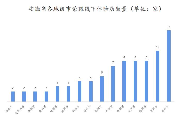 但安徽省蚌埠市荣耀线下体验店退出当地市场的情况并非个案,据荣耀官网显示,目前安徽全省线下荣耀体验店仅有82家。其中,在安徽省淮南市、马鞍山市、淮北市等多个地级市荣耀线下体验店数量更是仅有2家,最多的阜阳市也仅有14家。