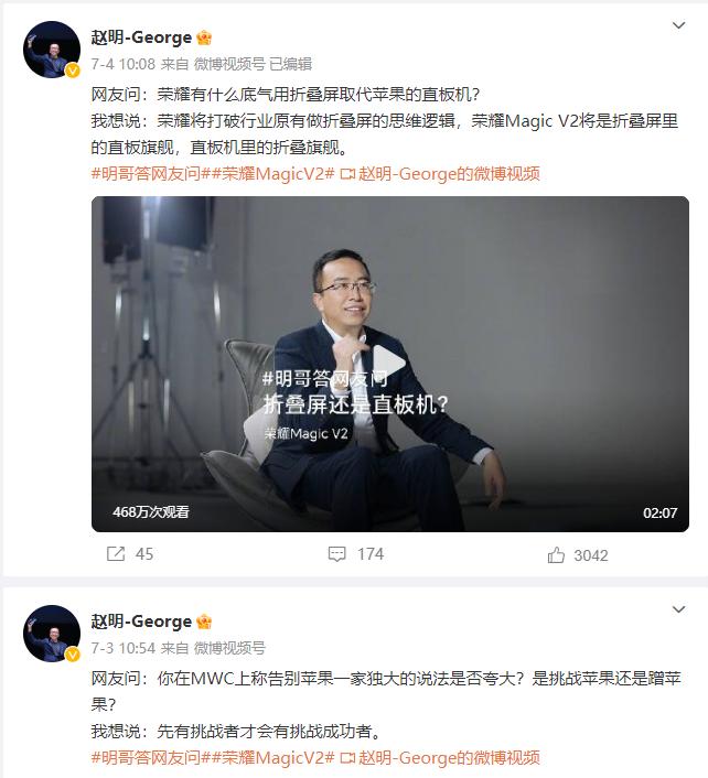 在一些社交媒体平台上,针对网友提出的「荣耀到底有何底气用折叠屏取代苹果的直板机」的问题,赵明回答道,荣耀将打破行业原有做折屏的思维逻辑,荣耀Magic V2将是折叠屏里的直板旗舰,直板机里的折叠旗舰。