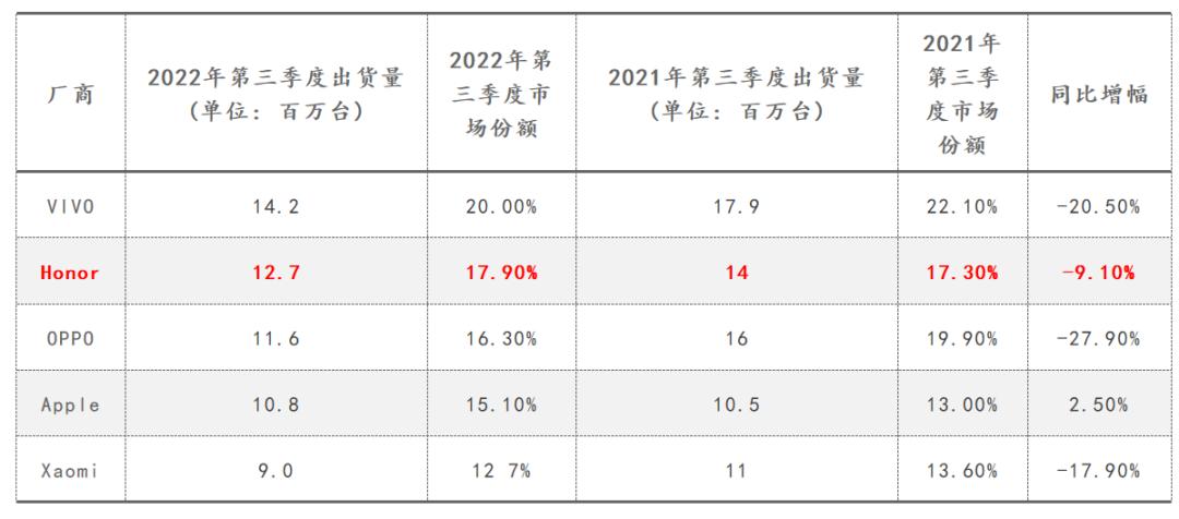 据投行杰富瑞的分析报告显示,上市3天iPhone 14系列的销量约为98.7万部,相比iPhone 13系列销量下滑了11%,成为历代iPhone最不受欢迎的一款。从这一角度来看,荣耀自然面临着销量下跌的命运。