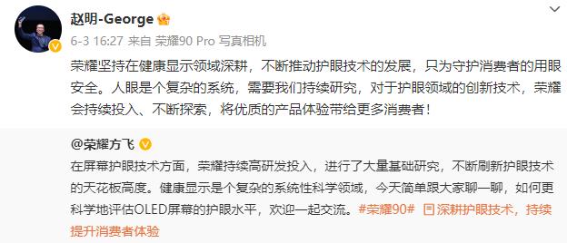 面对华为高管的质疑,荣耀产品线总裁方飞和赵明二人均指出,荣耀在护眼技术进行了大量投入,未来仍将继续投入,以给消费者带来更优质的产品。