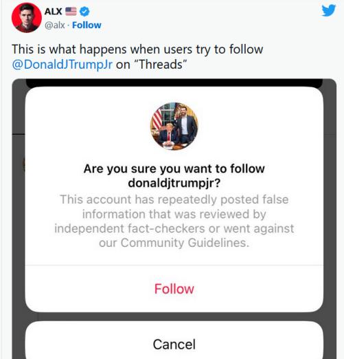 另一名用户在试图关注美国前总统唐纳德·特朗普的儿子时,收到了确认信息:“你确定要关注吗?这个账户反复发布虚假信息。”Meta发言人随后向媒体展示了公司发给特朗普的信息:“是个错误,不应该发生”,并称已经“修复”。