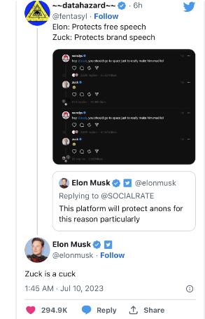昨天,马斯克还在推特上不客气地开麦:“扎克就是个懦夫/软蛋(Cuck)。”这是对一位网友的回应,该网友称推特维护内容自由,而Threads维护品牌自由。