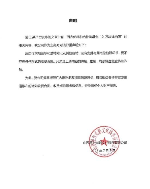 7月8日,周杰伦演唱会主办方发布声明:周杰伦演唱会呼和浩特站以及其他各站没有安排与周杰伦拍照环节,更不存在任何形式的收费合影,上述内容的传播、推销均涉嫌虚假宣传和诈骗。