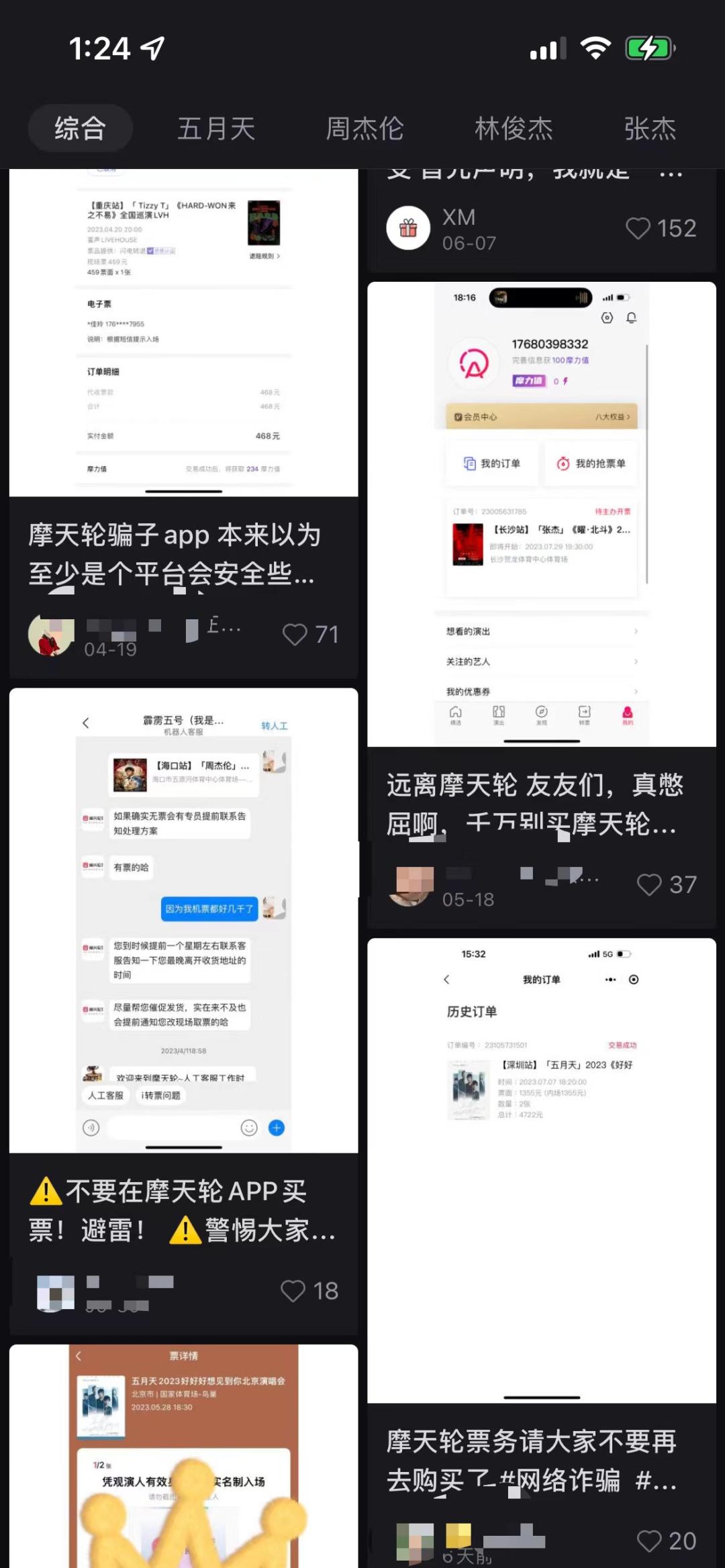 有大量用户在小红书吐槽,一张1500元的门票,在摩天轮票务APP上卖到了6580元,客服不回复,退票时还扣了1500元。还有用户表示摩天轮APP在演唱会4天前给自己自动退了票,用户还需还赔款40%。