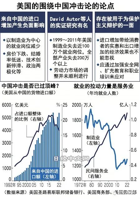 2001年加入世界贸易组织(WTO)的中国经济发展迅速,美国也成为受到进口打击的地区,面临失业增加和工资下降。David Autor等人估算称,美国在1999~2011年丧失近100万个制造业就业岗位,全部行业减少200万~240万个就业岗位。