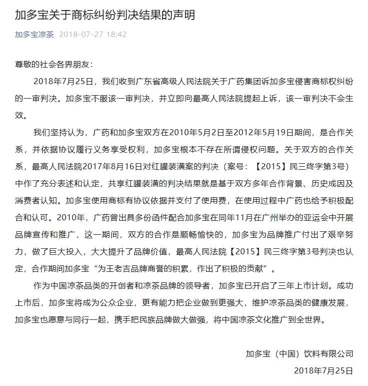 7月10日下午,加多宝通过官方公众号“加多宝凉茶”发布了一则“关于与广药商标纠纷案一审判决的声明”。