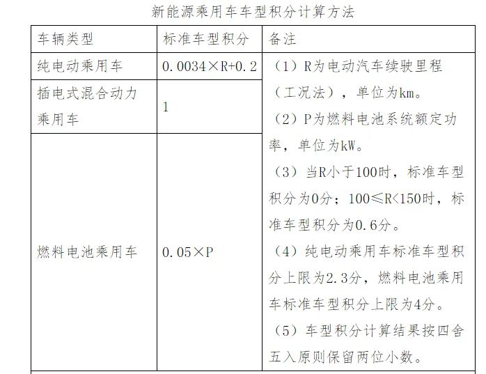当续航里程低于100公里时,标准车型积分为0分;当介于100公里~150公里时,标准车型积分为0.6分;插电式混动汽车积分由1.6分修改为1分,下降37.5%;燃料电池车积分从此前的0.08×P(分值上限6分)修改为0.05×P(分值上限4分),其中P为燃料电池系统额定功率。
