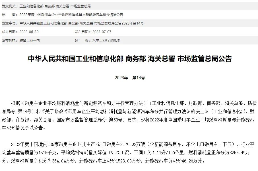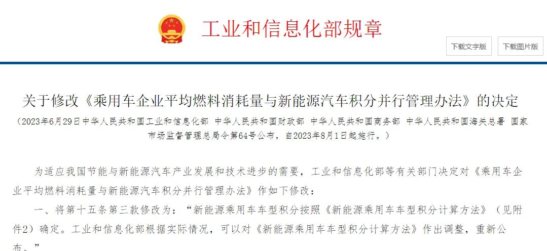 日前,工信部等部门联合发布的《关于修改〈乘用车企业平均燃料消耗量与新能源汽车积分并行管理办法〉的决定》(以下简称《决定》)明确,对现行《乘用车企业平均燃料消耗量与新能源汽车积分并行管理办法》进行修改,自2023年8月1日起施行。