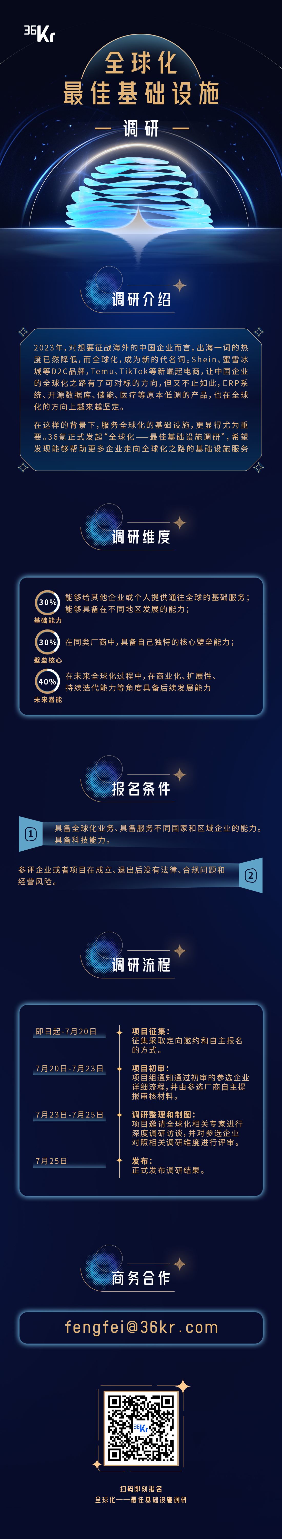36氪也在持续关注全球化企业,希望它们在发展壮大的同时也能够给全球化带来更加繁荣的未来。因此,36氪发起了WISE2023全球化——最佳基础设施调研,将评选出10家具备“基础能力”“核心壁垒”“未来潜能”的基础设施提供商: