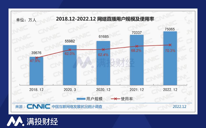 从用户增长来看,根据2022年中国互联网发展报告,截至2022年12月,我国网络直播用户规模达7.51亿,较2021年增长4728万,占网民整体的70.3%。其中,电商直播用户规模达到5.15亿,较2021年增长了5105万,占网民整体的48.2%。