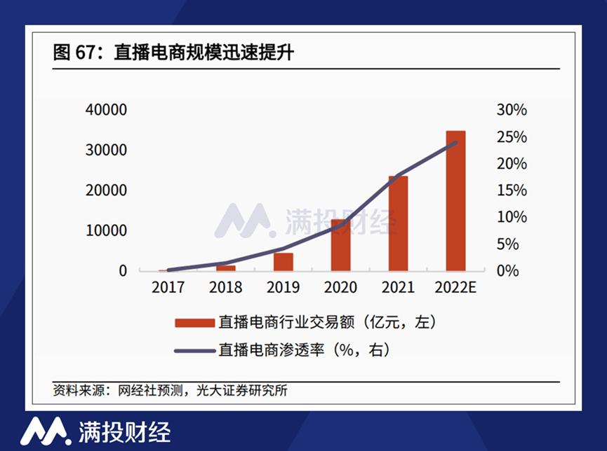 对比直播电商的规模渗透率和用户渗透率,在用户渗透率达到70%的情况下,直播电商的规模渗透率仅在25%左右,说明行业在得到流量的同时,还没有完全挖掘用户的购买力,直播电商的营收天花板仍有较大的提升空间。