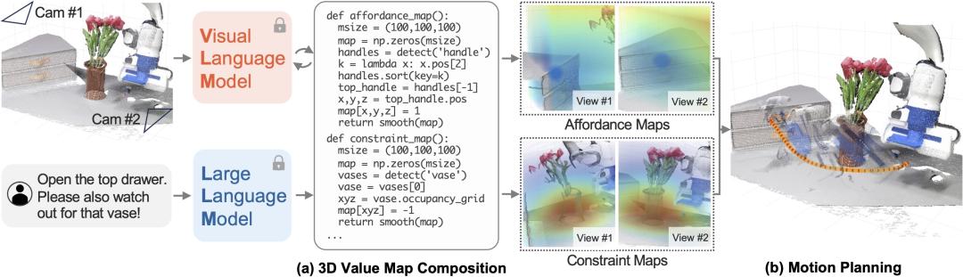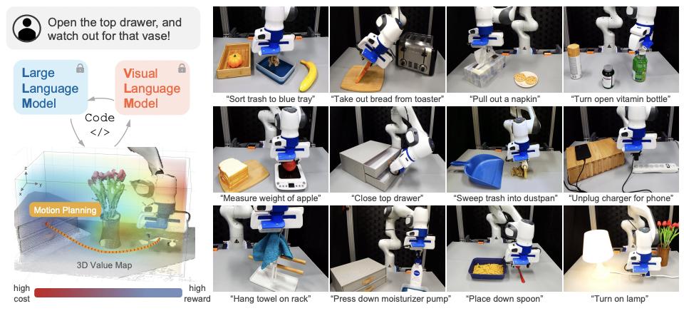 该项目通过从大语言模型和视觉-语言模型中提取机会和约束,构建3D值地图,可以让机器人在零样本学习的情况下,理解指令,分解任务,规划路径,并最终实现操作任务。