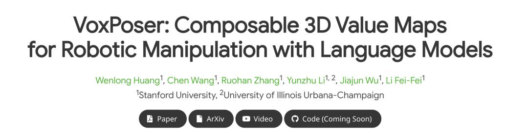 就在近期,由知名美籍华裔人工智能学者李飞飞带队的项目组,发布了一项最新的“具身智能”成果——VoxPoser。