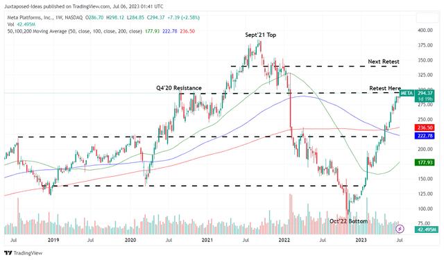 不过,Meta现在可能会在短期内重新测试 20 年第四季度的阻力位。虽然我们相信其 23 年第 2 季度财报电话会议将带来良好业绩,但由于广告市场疲软和对衰退的担忧达到顶峰,乐观情绪能否持续尚不确定。