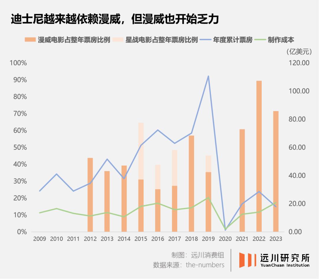 受疫情影响,全球电影业哀鸿遍野,迪士尼也不能幸免。从2020-2023年,迪士尼的票房收入在20亿美元徘徊,而这只是2019年百亿票房的1/5,曾经被寄予厚望的漫威系列,也哑火了。