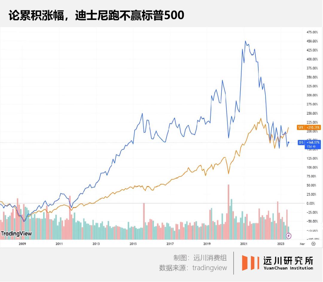但热情的中国城市,拯救不了迪士尼当下的窘境:躺在地上的电影票房、越努力越心酸的流媒体业绩、饱受争议的文化立场……反映到股价上,过去十年,迪士尼一直跑赢大盘的存在,到了2022年,迪士尼股价腰斩,且罕见的被大盘甩在身后,市值相比最高点已经跌去了2000亿美元。