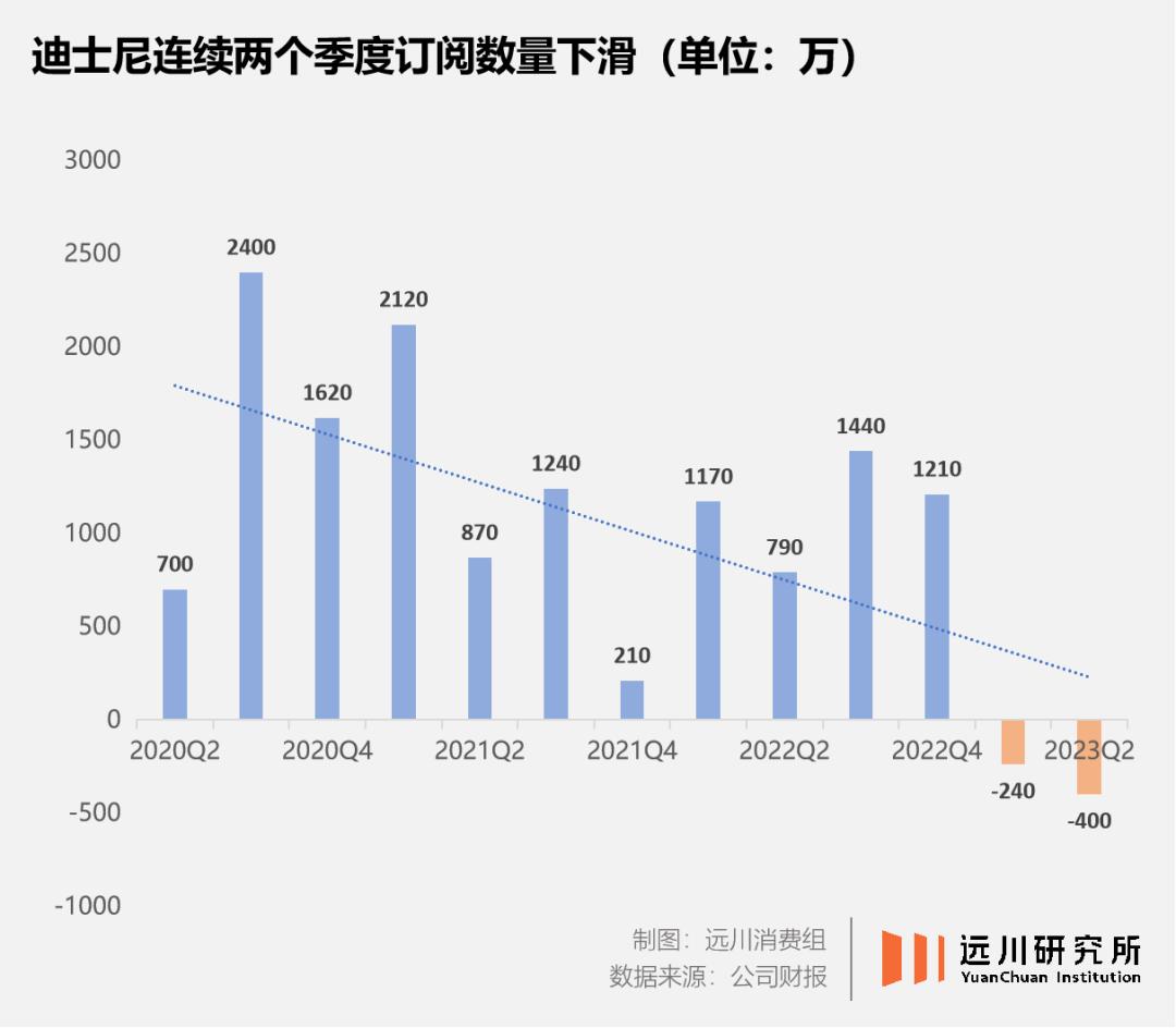 更糟糕的是,2022年Q1-Q2,奈飞连续两个季度用户流失,累计120万,单看数量微不足道,但却是十年来奈飞用户数的首次下滑。同样的剧情也在2023年的迪士尼上演。