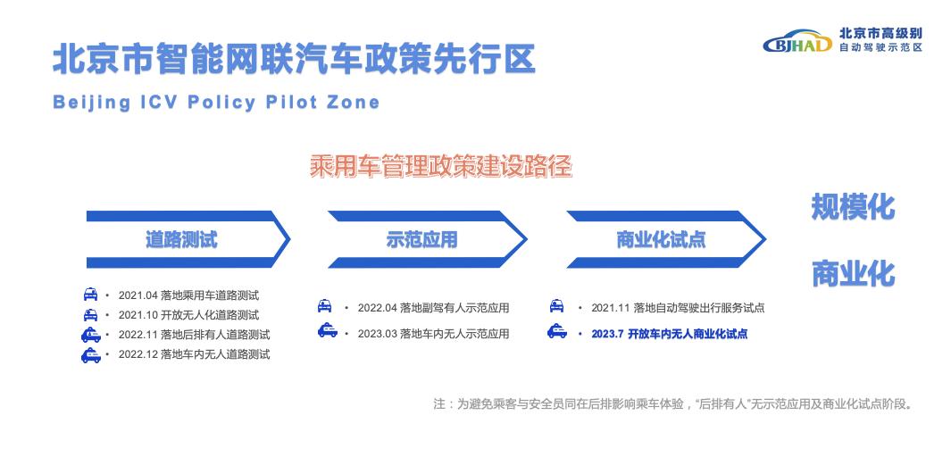 2021年4月,北京市智能网联汽车政策先行区(以下简称“先行区”)成立,既宣布分阶段有序推进场景开放。同年10月至11月,在国内率先开放车内有安全员的自动驾驶无人化道路测试与出行服务商业化试点。今年3月,进入“车内无人”载人示范应用阶段。