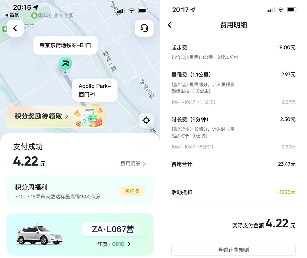 我们也在现场体验了百度的Robotaxi,从荣京东街地铁站到百度Apollo Park,大概1公里多的距离,花费4.22元。相比网约车/出租车起步10多元的价格,显然是很便宜的,不过由于车辆目前整体还比较少、运营范围有限,也存在等待时间较长、起停点必须在站点等问题。