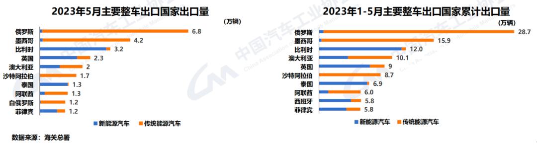 2023年1-5月出口俄罗斯车辆为28.7万辆,出口比利时则为12.0万辆。