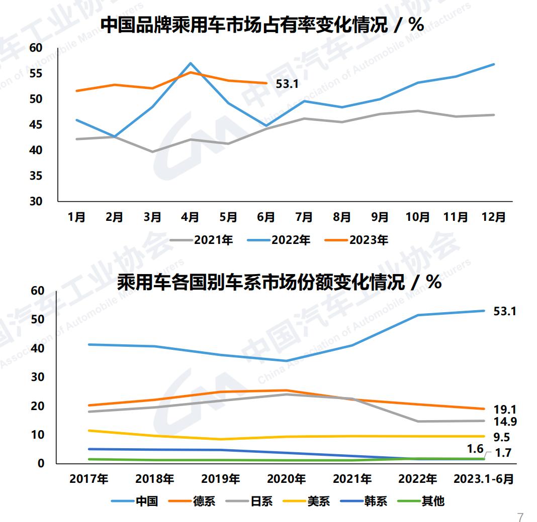 在品牌方面,6月中国品牌乘用车销量为120.5万辆,同比增长21.2%,市场份额达53.1%,上升8.4个百分点。在整个上半年的数据中,中国品牌乘用车销量为598.6万辆,同比增长22.4%,市场份额同样为53.1%,上升5.9个百分点。