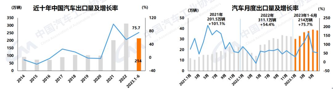 1-6月汇总数据来看,上半年汽车出口214万辆,同比增长75.7%。新能源汽车出口53.4万辆,同比增长1.6倍。