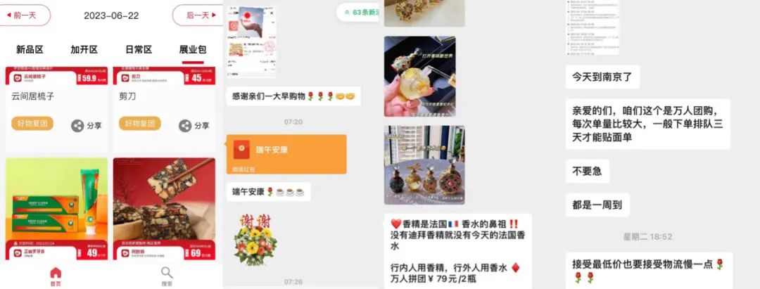 每天我点进这个平台的小程序,在里面选品,选好了就把链接发到群里给大家分享,再写点推荐文案。有的人不看群,我就会编辑好信息群发私信给别人,打个招呼,发个图片,人家回我了,自然就会看到我今天卖的什么东西。