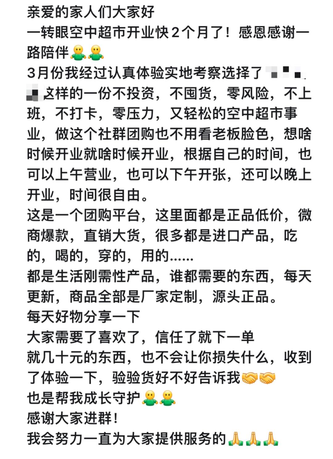 今年,雪姨开始在一个社区团购平台里做团长,说是主打私域流量,社交裂变。网上对这个平台恶评很多,说里面有杂牌假货,发货慢,无售后,拉人头,伤人脉。我旁敲侧击问候了几句,她发来一个线上会议让我加入试听。
