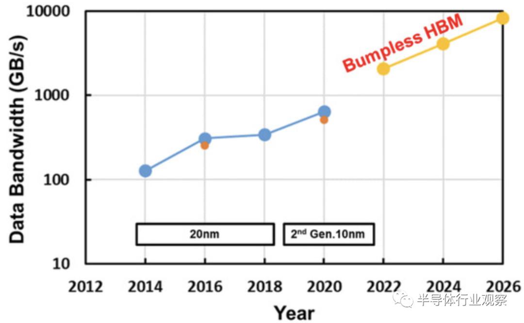 从上图我们可以看到HBM 数据带宽路线图。通过实现因 I/O 数量增加而带来的并行性增强,预计没有任何bumps的 HBM 带宽将不断增加。至于I/O功耗,bumpless HBM的第一个目标是当前HBM2的三十分之一,如下图所示。