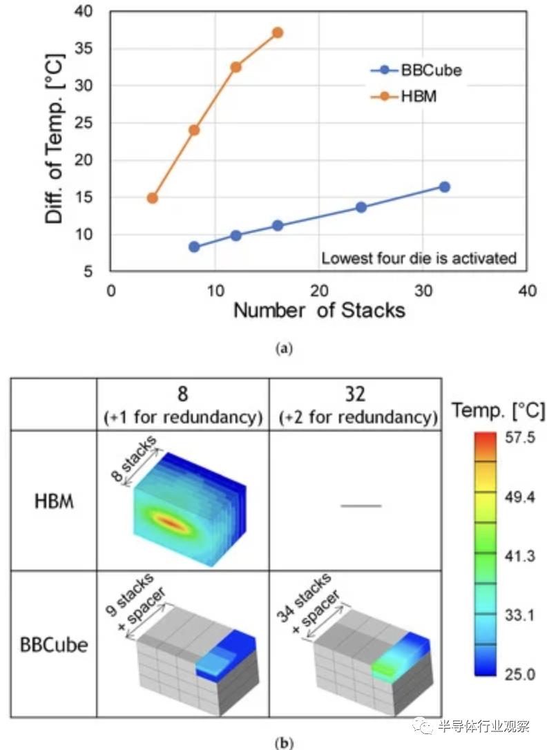 从技术上看,BBCube 中的 TSV 直接连接到底部裸片,而对于传统 3DI,需要在 TSV 之间放置焊料和 BEOL 层,这会增加热阻。BBCube 情况下的热阻是传统 3DI 的 1/4。下图则显示了室温下堆叠 DRAM 顶部与DRAM Cell最高温度的温度差。在堆叠DRAM的底部,HBM 和 BBCube 中均放置了具有相同功耗的基础裸片。对于具有 9 个堆栈的 BBCube,由于热阻较低,DRAM 单元温度差异为 8.3 °C。即使堆叠 34 个芯片,BBCube 中的温差仍为 16 °C,大约是堆叠 8 个芯片的 HBM 的三分之二。BBCube 允许堆叠的芯片数量是 HBM 的 4 倍。这使得使用 16 Gb DRAM 芯片的内存容量达到 64 GB。