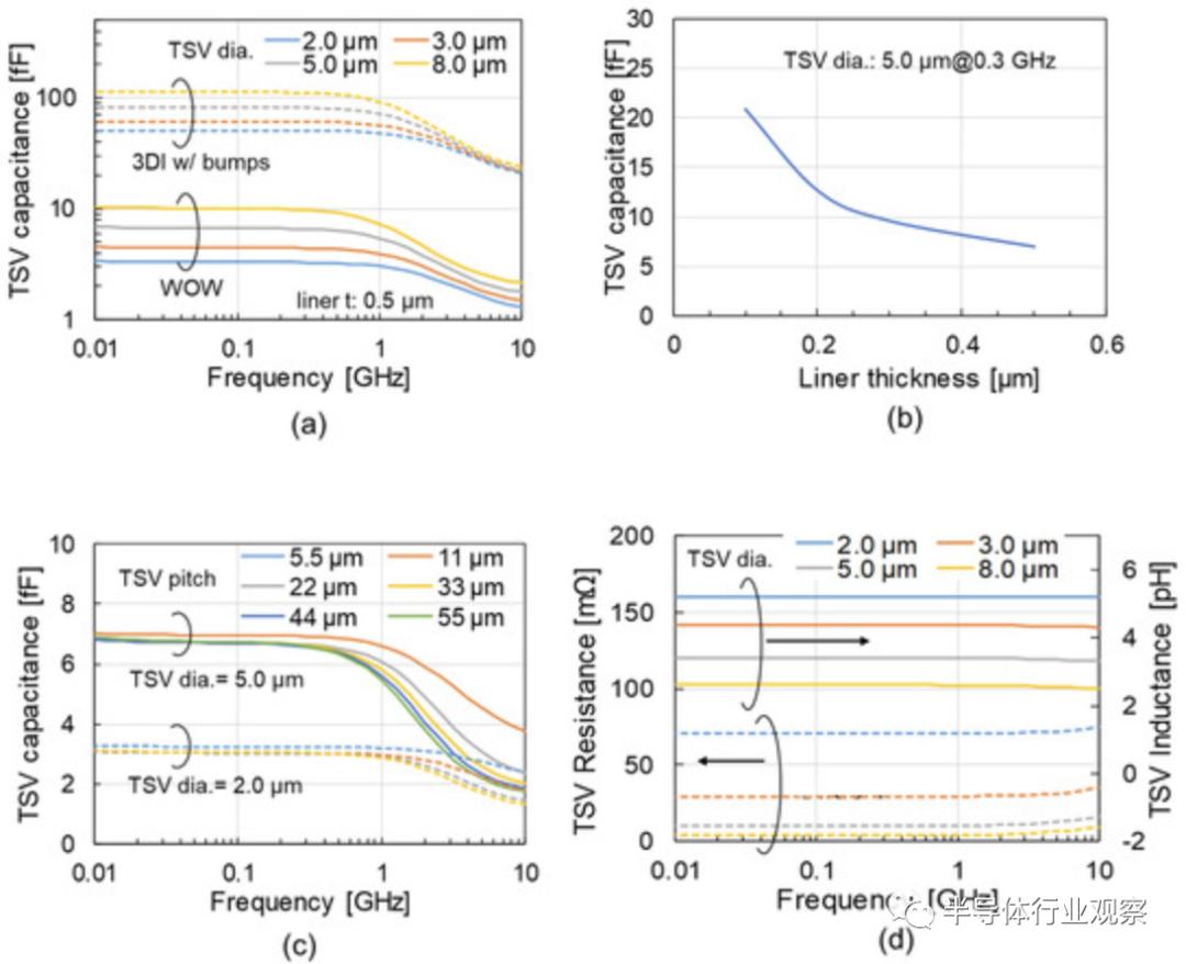 在实际测试中,从下图a我们可以看到该方案的 TSV 电容的频率特性。由于慢波(slow-wave)模式,它增加到 3 GHz 以下。下图b则指出,衬垫厚度(liner thickness)决定了 3 GHz 以下的 TSV 电容。TSV 直径和 Si 厚度也决定了 TSV 电容,可以通过采用 BBCube 来减小 TSV 电容。
