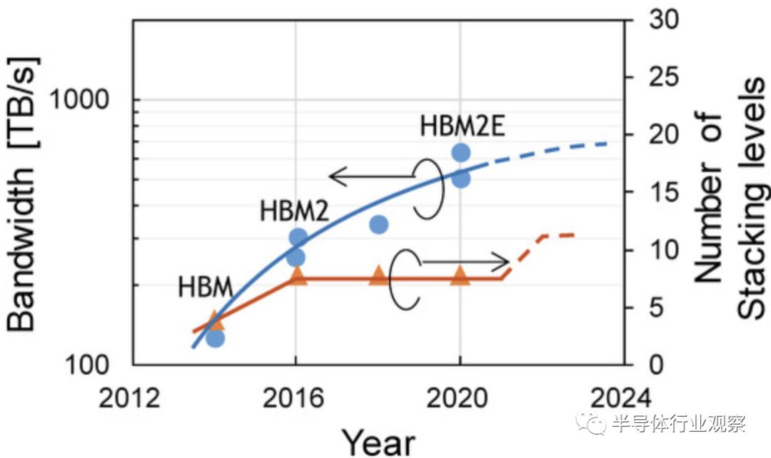 事实上,由于凸点间距的限制,最近的高带宽存储器(HBM)的带宽趋于饱和,如下图所示。但就 BBCube 而言,由于 BBCube 使用高密度 TSV 和新颖的内存架构,因此可以实现高一个数量级的带宽。根据WOW联盟的说法,考虑到键合对准的成熟度,TSV间距将每三年缩小一次。