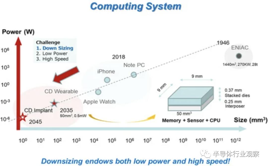 众所周知,计算系统历史上存在三个关键挑战:(1)尺寸减小,(2)功耗降低,(3)速度提高。在这些关键要素中,尺寸减小是最迫切的挑战,因为低功耗和高速都可以通过尺寸减小本身来实现。下图显示了计算系统路线图。根据推断趋势,到2035年,目标器件体积将达到50 mm3,功耗为0.5 mW。这样的设备可能类似于人工智能机器蜜蜂,具有 CPU/GPU、DRAM、NAND 闪存和传感器。它将服务于人类用户,让AI机器蜂可以观察用户周围的环境,保护用户,并充当行政秘书。