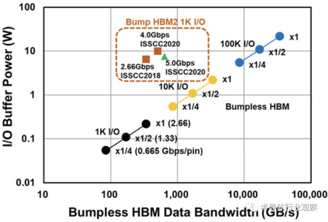 根据I/O 数量,我们还能从下图获得了带凸块 HBM2 和无凸块HBM的数据带宽和I/ O缓冲功率。