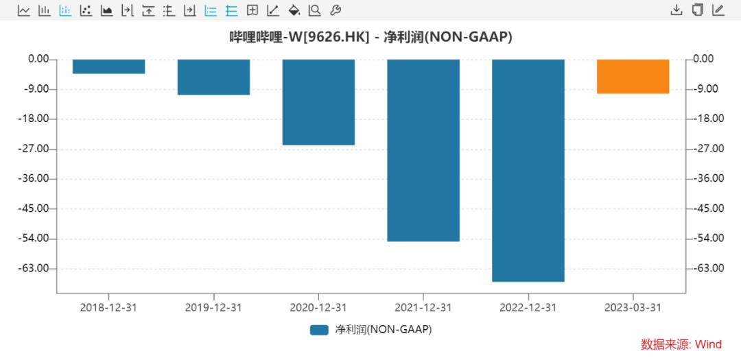 现在是2023年7月,距离B站立的flag——2024年盈亏平衡的——越来越近。从年度净利润(NON-GAAP)来看,亏损是越来越大,虽然1Q23亏损有所减小,但亏损额度仍有10.3亿之多。