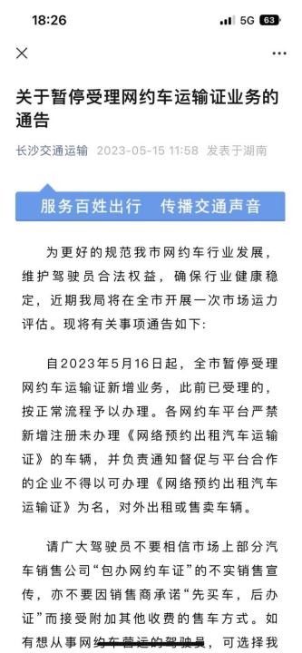 湖南省长沙市交通运输局前两个月发布了限制通告,自5月16日起,全市暂停受理网约车运输证新增业务,此前已受理的,按正常流程予以办理。