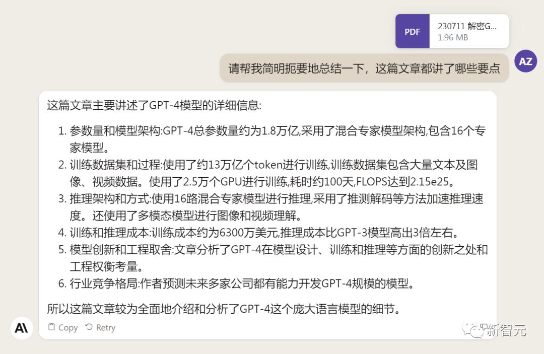 昨天SemiAnalysis曝出的GPT-4架构大爆料,咱们试试直接把中文文档投喂给Claude 2,让它来做一份总结。
