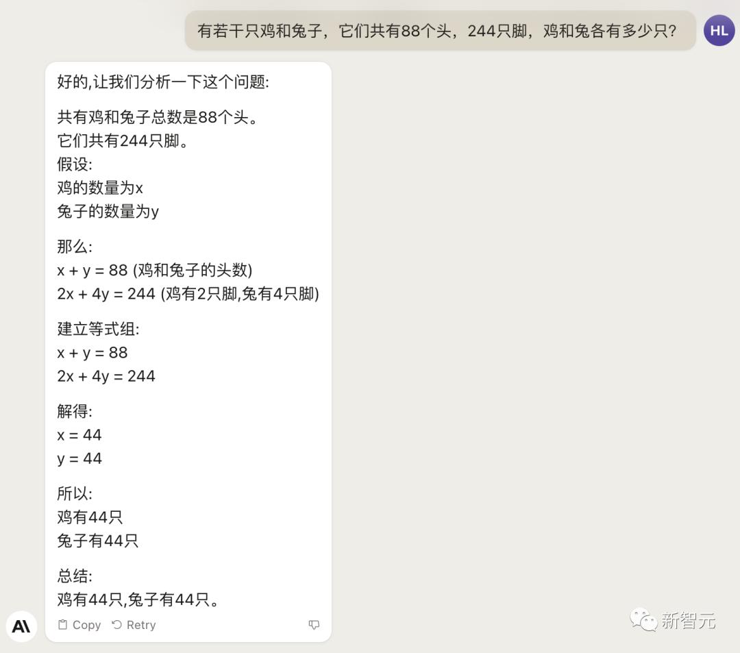 对于经典的鸡兔同笼问题,Claude 2果然还是寄了……
