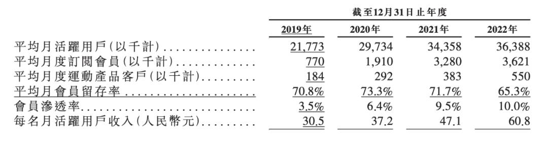 招股书显示,Keep的月活跃用户转为会员的转化率(或会员渗透率),四年来有小幅上涨,从2019年的3.5%增至2022年的10%。而且会员留存率相对乐观,平均月会员留存率保持在70%左右。