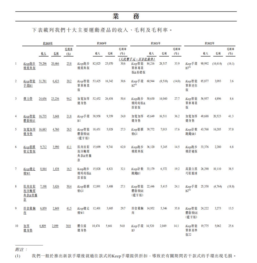 在卖货业务上,Keep不仅销售健身配件(如瑜伽垫、哑铃、运动服),还有智能健身设备(如智能单车、手环、跑步机)。其中,跑步机在2019年、2020年卖得最好,2021年、2022年,则分别是单车和手环位列收入榜单第一名。