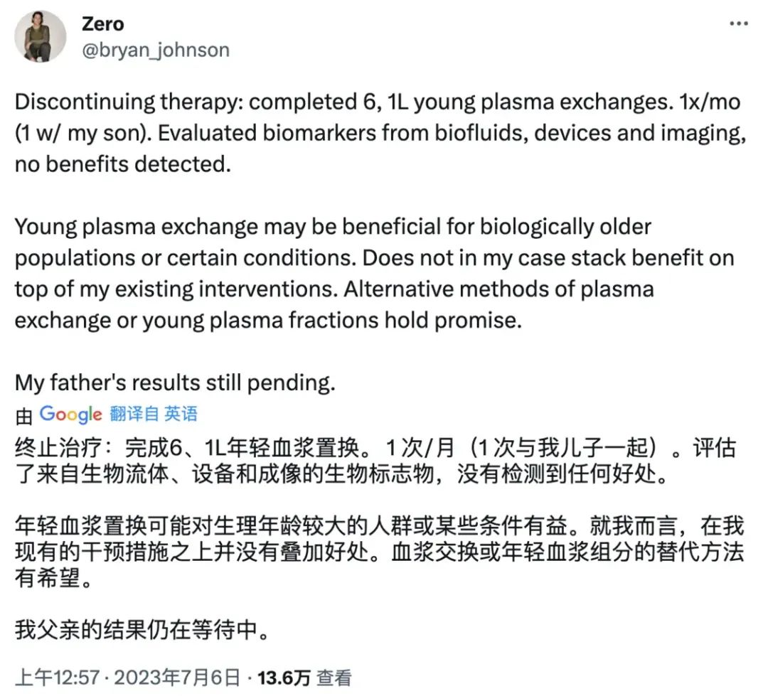 不过他认为,这种血浆置换疗法可能对年龄更大的人可能有帮助,他父亲的结果还没出来。“年轻血浆置换可能对生理年龄较大的人群有益或者在某些条件下有益。从我自身情况来看,这种疗法并没有在我现有干预措施基础之上叠加好处。血浆置换或年轻血浆成分的替代方法蕴含希望。我父亲的结果仍在等待中。”他在推特上写道。