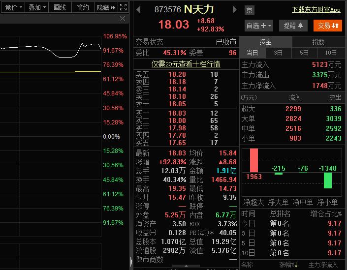 犀牛之星7月12日讯,今日N天力(873576)在北交所上市,并从新三板摘牌。开盘价格15.47元/股。截至收盘,天力复合上涨92.83%,收盘价18.03元/股,换手率40.34%,成交量达1.91亿元,总市值19.29亿元。