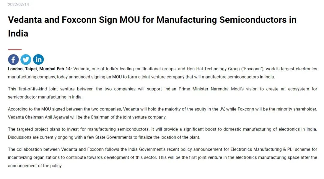 2022年2月,富士康宣布,将与韦丹塔合作,在印度建立一家芯片工厂。富士康当时称,两家公司已同意成立一家芯片合资企业,富士康将投资1.187亿美元,持有该合资公司40%的股份。