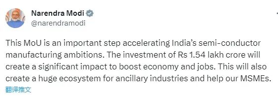 印度总理莫迪曾亲自在社交媒体上转发该消息称其为“印度半导体制造愿景的重要一步”。