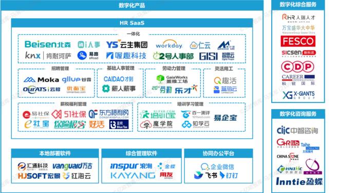 随着我国数字化人力管理行业的发展,目前,我国人力资源数字化服务市场上主要存在四类玩家:第一类是国内专业领域新兴厂商,从单一领域切入进行一体化布局。第二类是传统软件 企业转型厂商;第三类是国外大牌厂商主要服务于外企在中国的分支机构;第四类即国内跨界玩家,互联网科技公司纷纷进场。