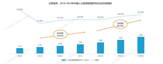 据报告统计,2021年中国人力资源数字化市场规模达到190亿元,未来三年将以22.5%的年复合增长率保持稳步增长,预计2024年达到 342亿元。在技术进步、企业数字化转型意识增强、疫情常态化背景下,企业数字化需求增加,人力资源数字化市场规模将持续快速增长。